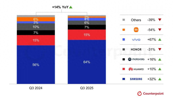 排名第一的是三星,它的市场份额为64%,同比增长32%,是全球智能手机市场的霸主。作为横向对比,在2024年Q3榜单中,三星以56%的市场份额排名第一,比第二名高出41%。出货量提升的原因很简单,三星Galaxy Z Fold7机身更轻薄更坚固,吸引了更多的消费者选购,销量方面超出了预期。同时三星Galaxy Z Flip7系列成绩也不错,最近还发布了旗下首款三折叠产品,第四季度的成绩依旧未来可期。